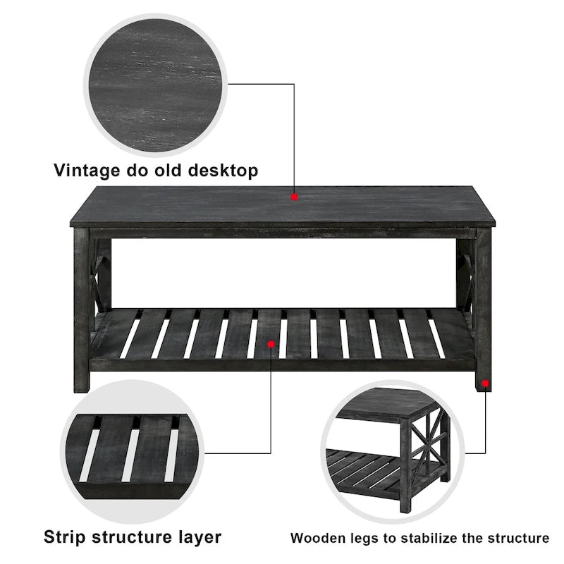 Bold Farmhouse Elegance: Designed with a rustic touch, this coffee table blends classic farmhouse elements with modern functionality. The open slatted lower shelf and X-frame sides create a timeless appeal that enhances any living space.