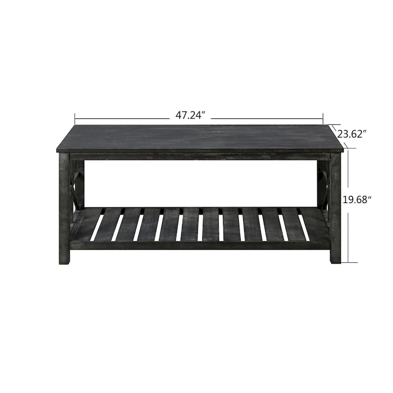Bring rustic charm and functional storage to your living space with this beautifully crafted farmhouse coffee table. Featuring a spacious tabletop and an open slatted lower shelf, it offers ample room for dcor, books, and everyday essentials. The sturdy wood construction with X-frame side details adds a timeless touch, making it a perfect centerpiece for any living room. Easy to assemble and designed for durability, this coffee table blends style and practicality effortlessly.