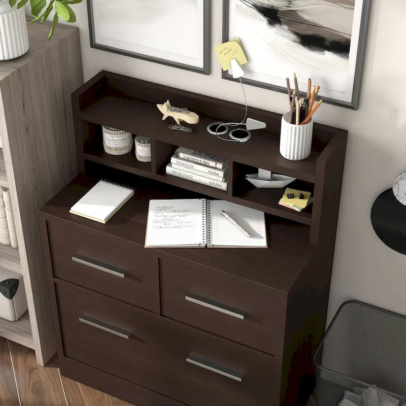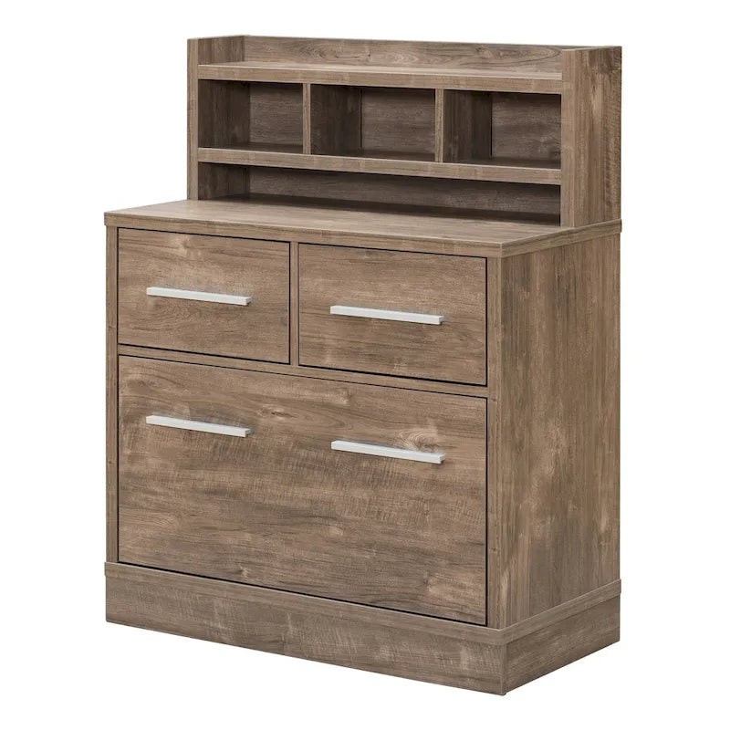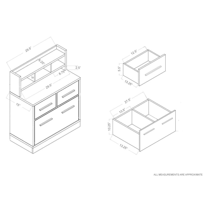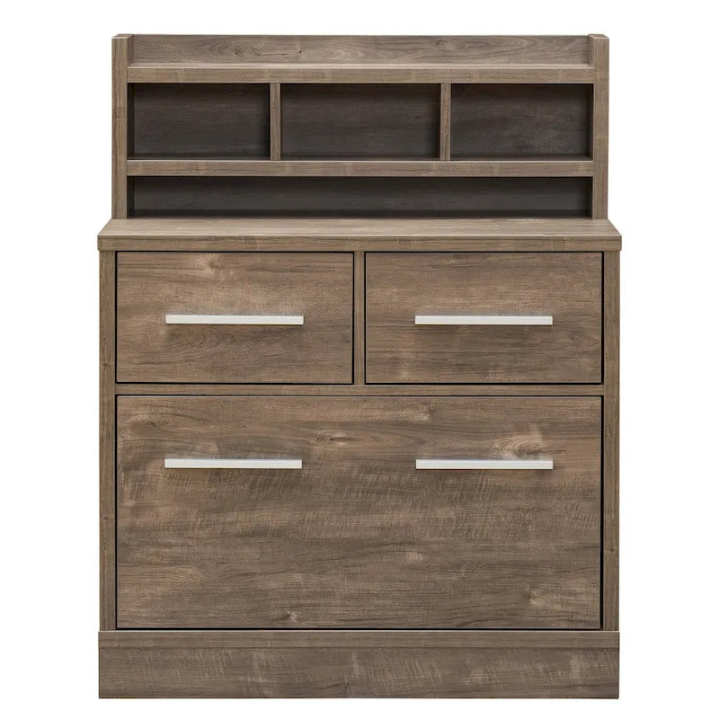 Multi-functional file cabinet with work station. Features 2 storage drawers, 1 filing cabinet, 3 open shelves, and top workspace. MDF construction with chrome drawer pulls.