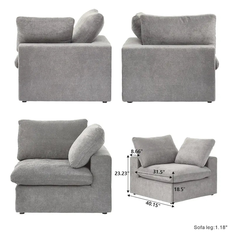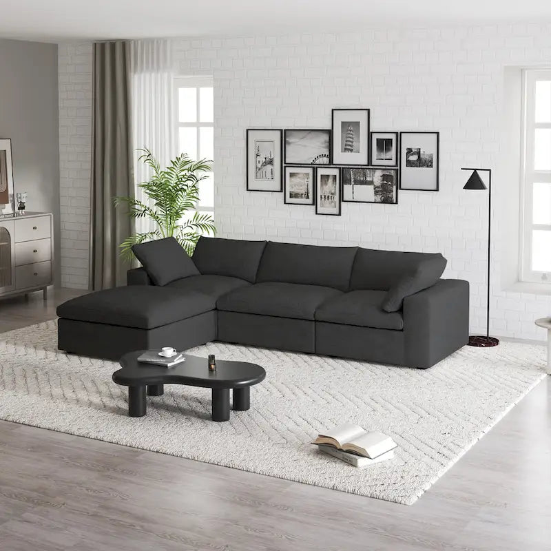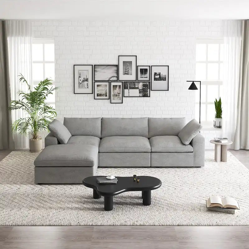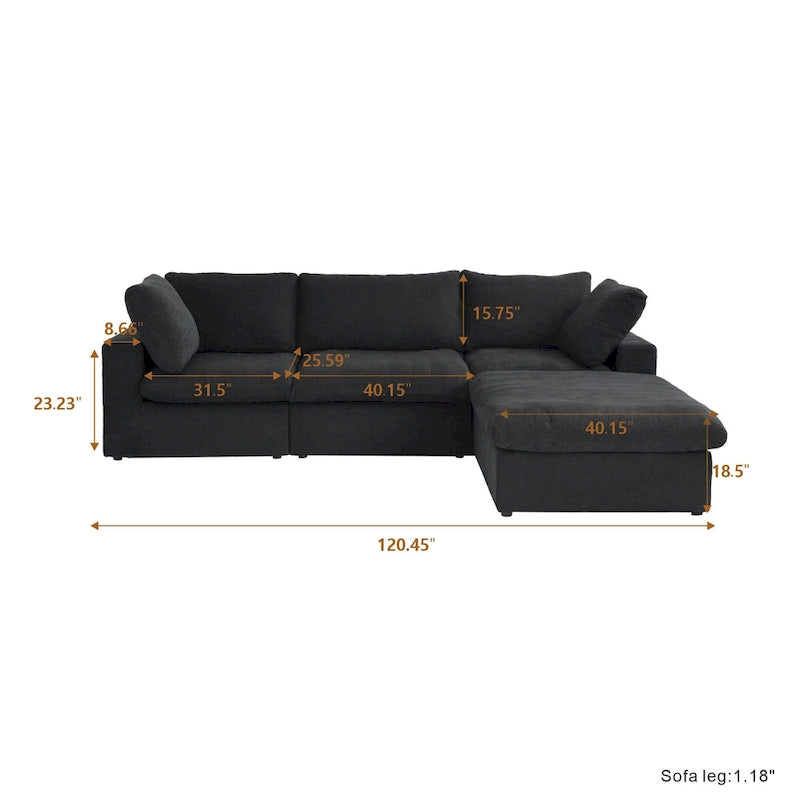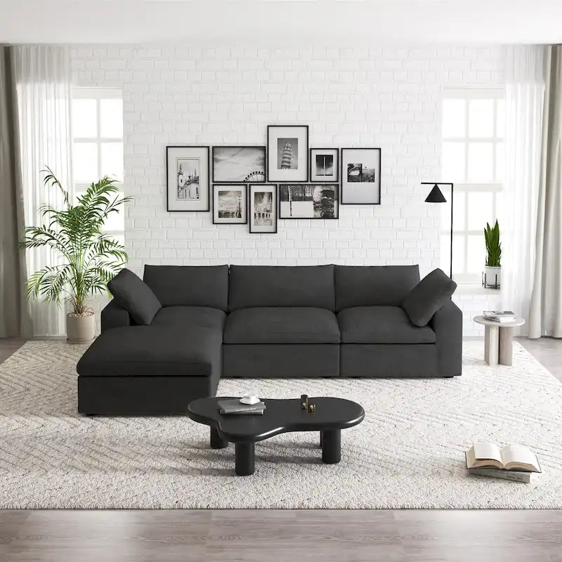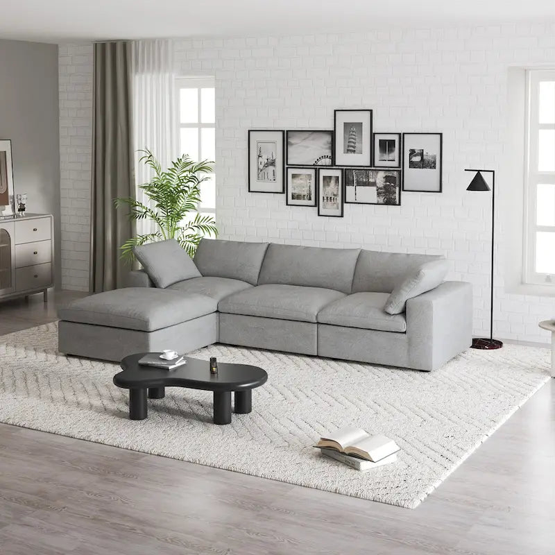 Modular L-shaped sectional sofa with down-filled cushions. Includes 2 corner chairs, 1 armless chair, and 1 storage ottoman. Features removable cushion covers for easy cleaning.