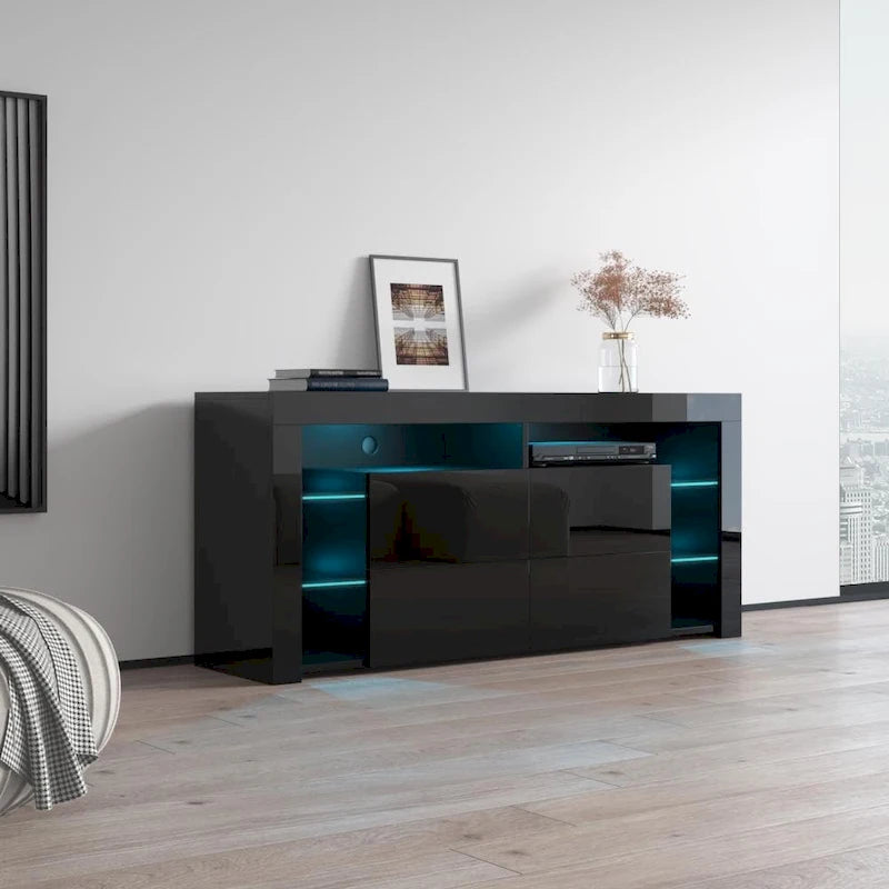 Modern TV stand with high-gloss finish. Fits up to 70" TV. Features 16-color LED lighting with remote, 4 cabinet shelves, and cable management.