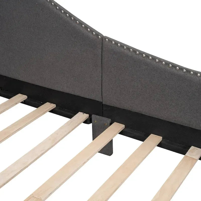 Twin size daybed with linen upholstery, headboard, and armrest. Pine wood and MDF frame with wood slat support. Functions as sofa and bed.
